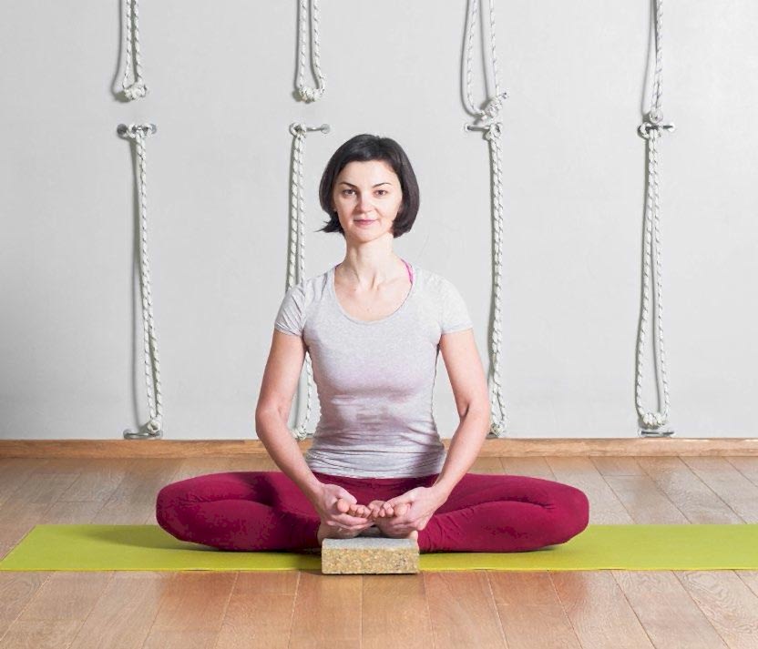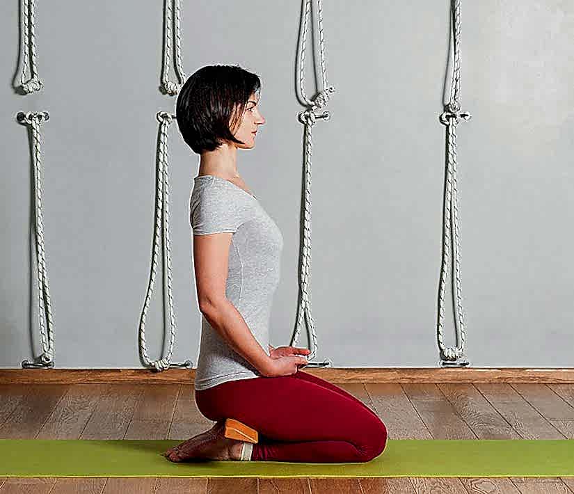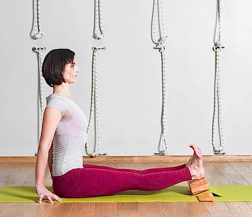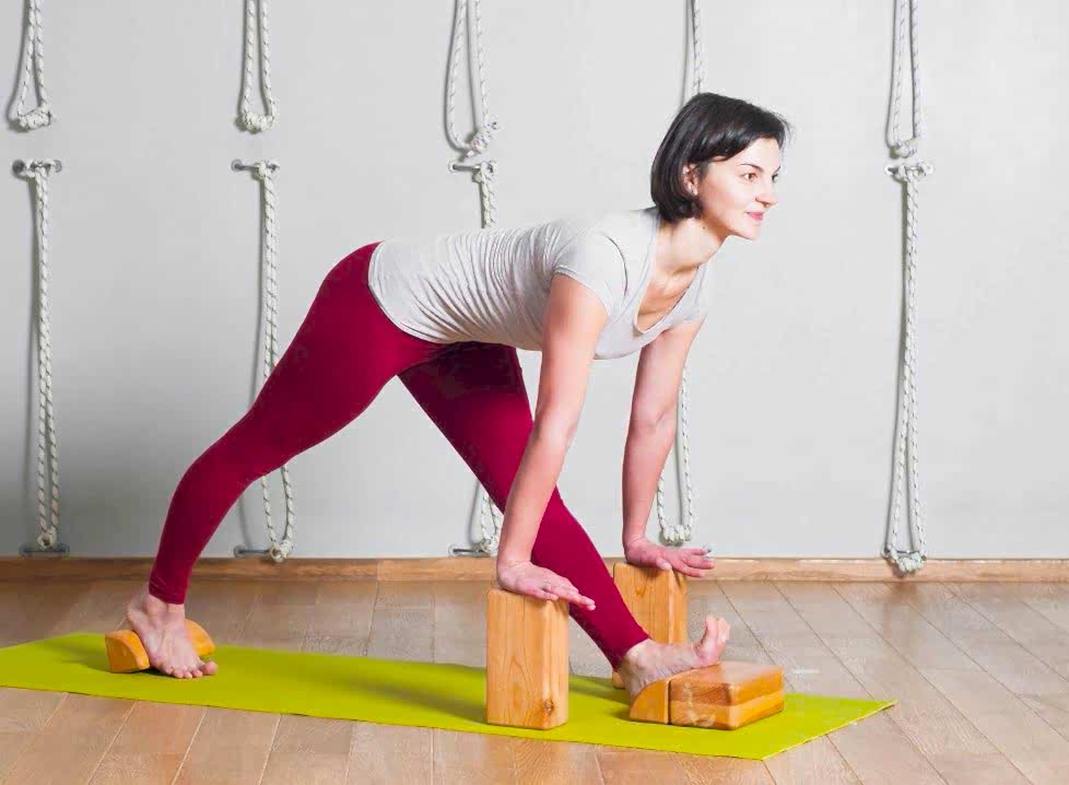 В этой позе при проблемах в стопах или лодыжках полезно под обе стопы поставить четвертинки кирпича. Это позволяет формировать правильный свод стоп и убрать чрезмерное напряжение из голеностопных суставов. Важно равномерно прижимать внутренний и внешний края стоп к кирпичу. Для этого на передней стопе создавайте движение от внешней лодыжки к внутренней, а на задней стопе от внутренней к внешней