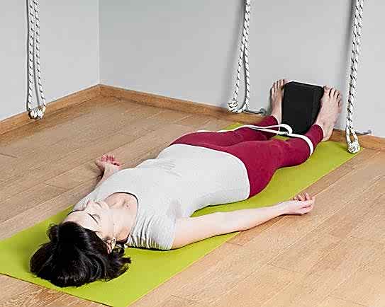 Чтобы расслабить стопы и сохранить максимальный эффект уравнивания внутренних и внешних частей стоп, поместите кирпич между стопами и зафиксируйте это положение ремнём на серединах голеней.