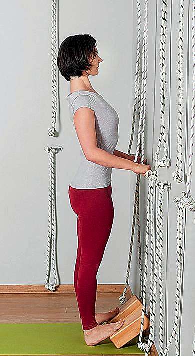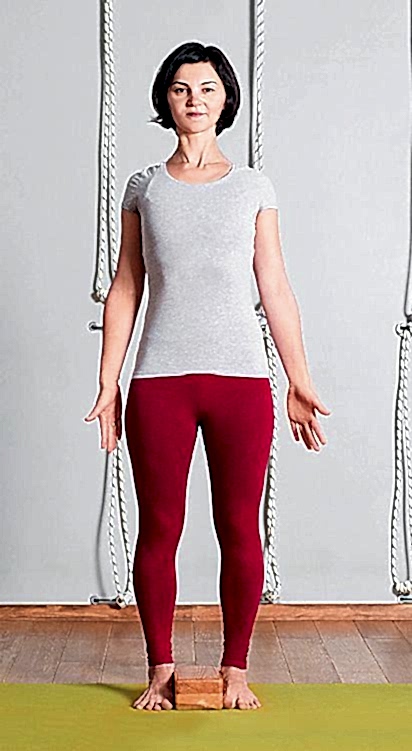 ВАРИАЦИЯ 2 Тадасаны у стены, передние части стоп подняты на кирпичи, задние лодыжки хорошо растягиваются, передние лодыжки углубляются. Это важная поза при работе со стопами, так как если задние лодыжки сокращены и икроножные мышцы сжаты, в положении стоя вес падает на заднюю часть пятки, в результате задняя часть колена перерастягивается назад, а передние части бёдер в качестве компенсации начинают выдаваться вперёд. В результате копчик отклоняется назад и поясница прогибается. В этой позе достигается сбалансированное состояние передних и задних лодыжек, и в положении стоя возможно перераспределить вес тела на переднюю часть пятки, которая является проекцией костей ног, соосность костей ног и позвоночника восстанавливается. Выполняя позу, лучше держаться за крюки, это помогает выравнивать всё тело, втягивать копчик и поднимать позвоночник вверх. Икроножные мышцы и задние лодыжки надо удлинять к пяткам, прижимая пятки к полу, а коленные чашечки поднимать вверх, удлиняя передние части бёдер.