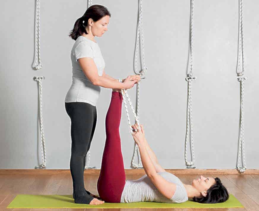 С этой позы хорошо начать практику, так как на стопы нет давления веса тела, и подошву можно как следует расправить. Когда стопы подняты вверх, уменьшается отёк и уходит усталость. Поместить веревку или ремень на переднюю часть пятки. Внутренние лодыжки поднимать вверх, стараясь коснуться верёвки, а руками тянуть верёвку на себя и опускать внешние части стоп. Расправлять пятки и передние части стоп от внутренних частей к внешним.
