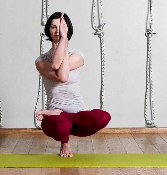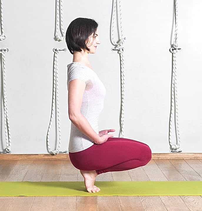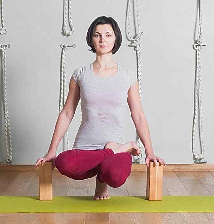 В ВАРИАЦИИ 4,5 выполните баланс на корточках, стремитесь к тому, чтобы стопы были перпендикулярны, а голени и бёдра параллельны полу. Арки стоп укрепляются и становятся жёсткими. Поза очень полезна для людей со слабыми мышцами стоп и при деформации большого пальца стопы. Если вы легко выполняете Падмасану, то заведите одну ногу на бедро другой ноги в Полупадмасану и учитесь балансировать в этой позе, опираясь руками на кирпичи.