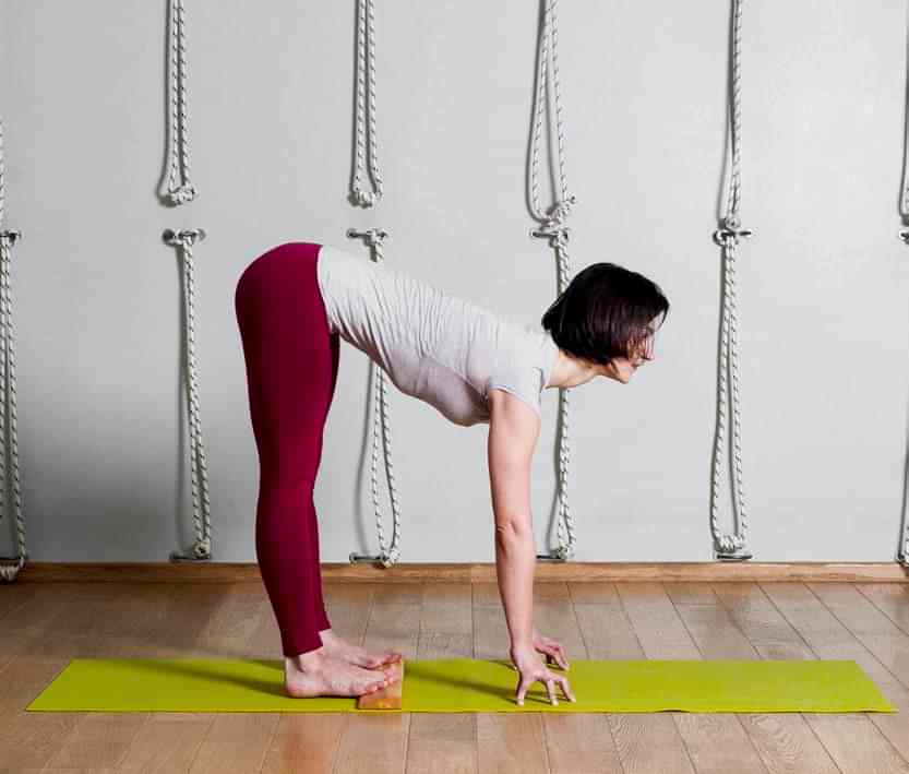 Одновременное раскрытие и укрепление голеностопных суставов происходит, если под передние части стоп в Уттанасане поставить косую планку. Пальцы ног удлиняйте вперёд, а пятки расширяйте и прижимайте к полу, удлиняя задние лодыжки и нижние части икроножных мышц. Передние лодыжки углубляйте к полу, а центры лодыжек поднимайте вверх.