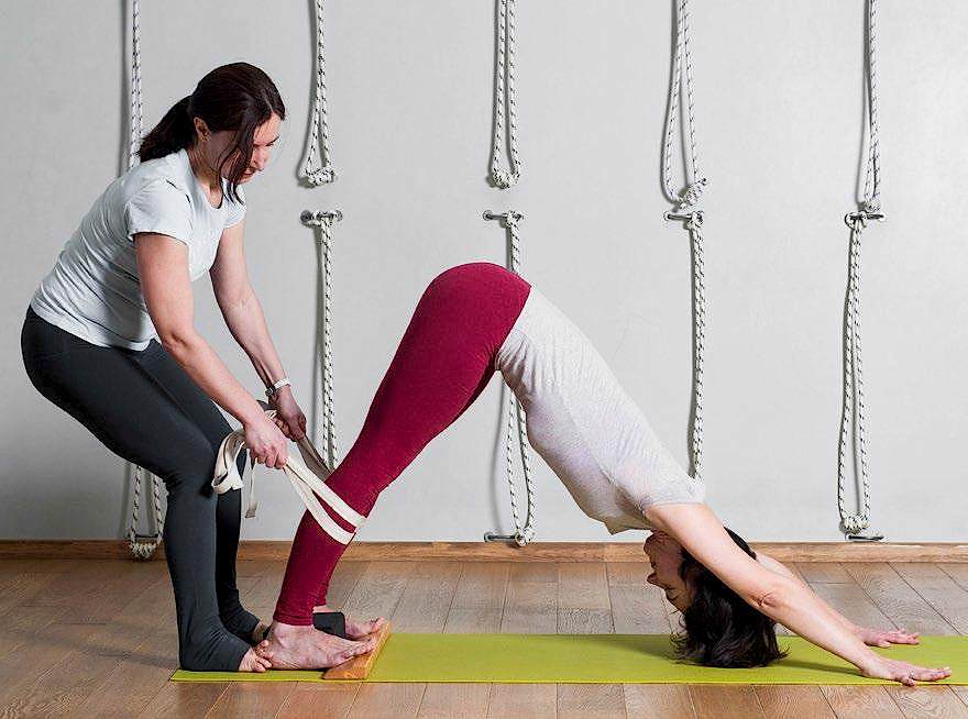 Если вы не можете поставить пятки на пол, то полезна помощь учителя, можно в этой позе ремнями продвигать сначала бёдра назад, а потом и голени назад, дополнительно растягивая икроножные мышцы и раскрывая задние части коленей, прижимая и расширяя задние части пяток на полу.