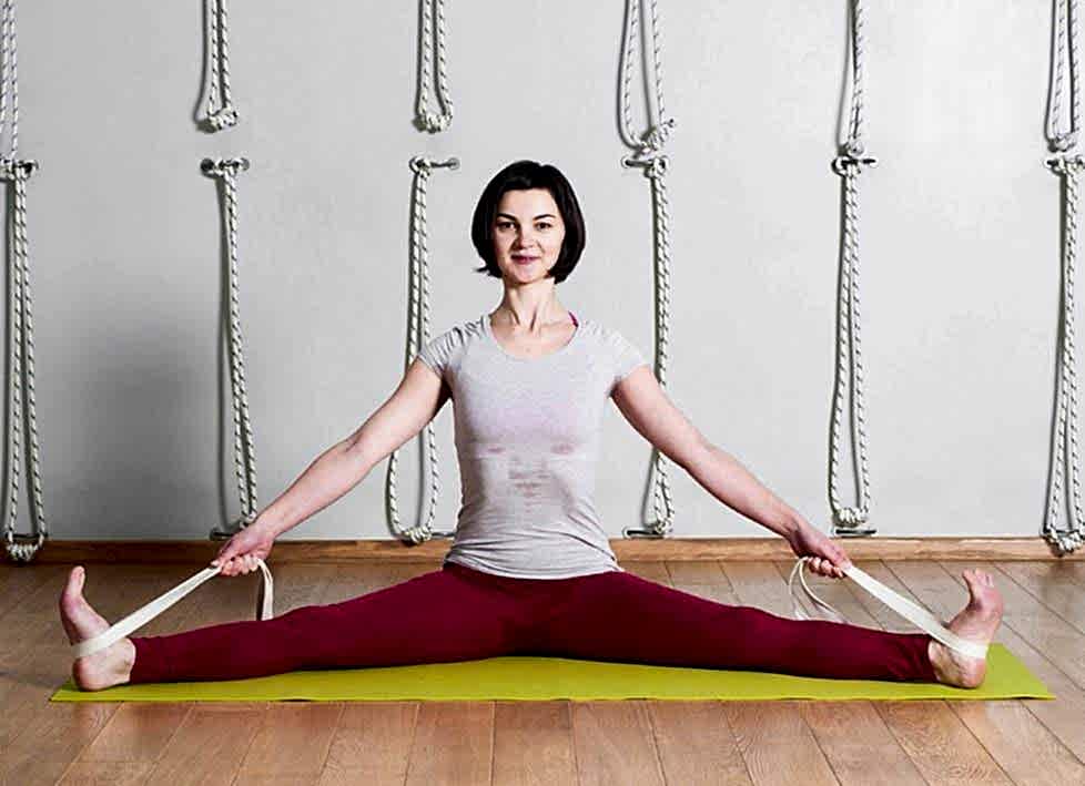 В этой позе с широко разведёнными ногами учитесь одновременно работать правой и левой стопой. Накиньте ремни на передние части пяток и держите их крепко, выталкивайте внутренними частями пяток ремни от себя, а внешние части стоп тяните ремнями на себя. Удлиняйте все задние части ног и особенно задние лодыжки. Заворачивайте кожу стоп от внешней к внутренней по линии передней лодыжки и удлиняйте пальцы ног вверх.