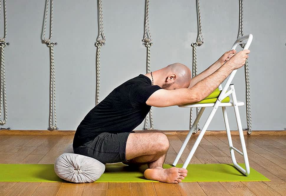 Сядьте на валик, перекрестите ноги и наклонитесь вперёд, вытягивая переднюю поверхность тела. Положите лоб на стул, даже если вы легко наклоняетесь вперёд, это создаст больше пространства в теле. Следите, чтобы линия бровей была параллельна полу. Локти также положите на сиденье стула, разведите их в стороны, отпустите трапециевидную мышцу вниз, чтобы освободить заднюю часть шеи. Выполните позу 2-3 минуты, затем поменяйте перекрёст ног.
