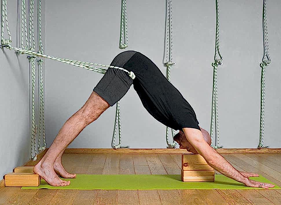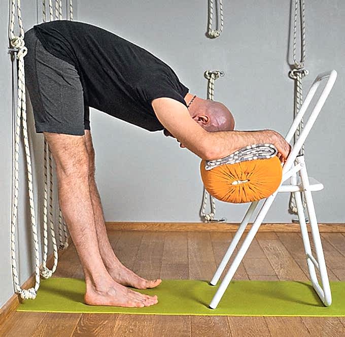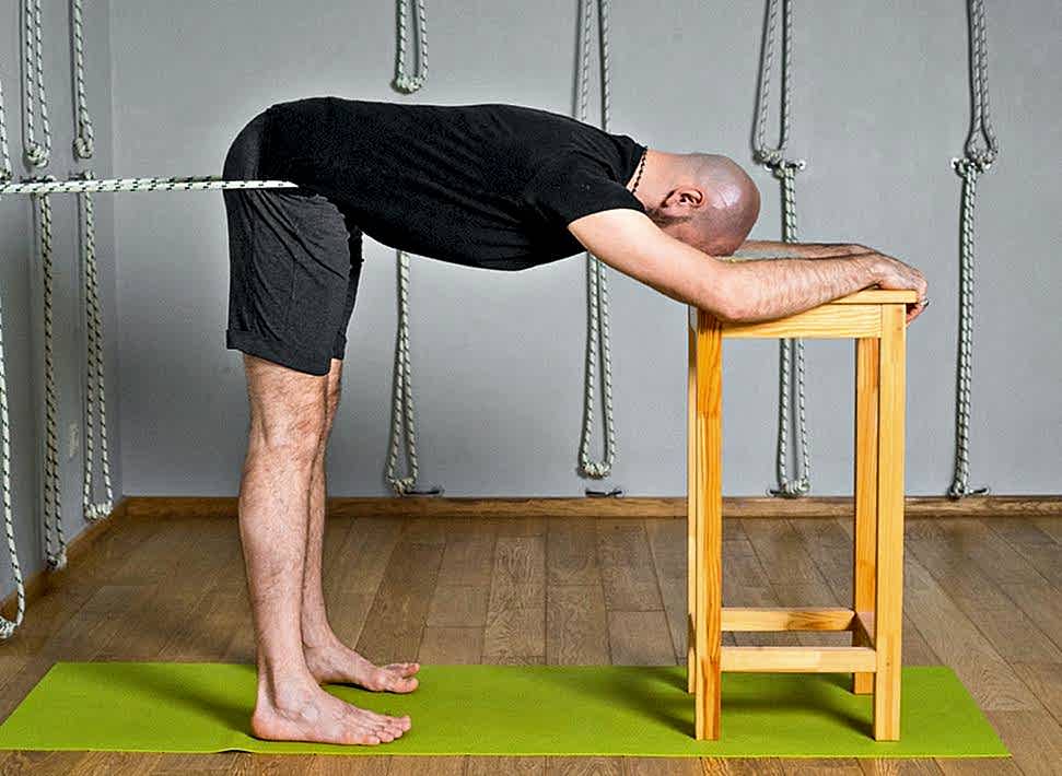 В этой позе мы опускаем голову на уровень с тазом. Если у вас есть верёвки на стенах, то выполните позу с верёвкой на бёдрах, это поможет отводить бёдра назад, освобождая живот. Лоб поместите на высокий стул, руки также положите на опору. Следите, чтобы верх рук не зажимал шею. Можно дома использовать стол для этой позы, но не помещайте живот на опору, следите, чтобы живот был свободным. Держите ноги вытянутыми, а ум пассивным. Оставайтесь в позе 2-3 минуты.