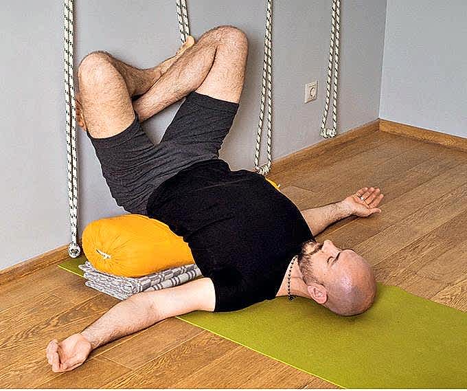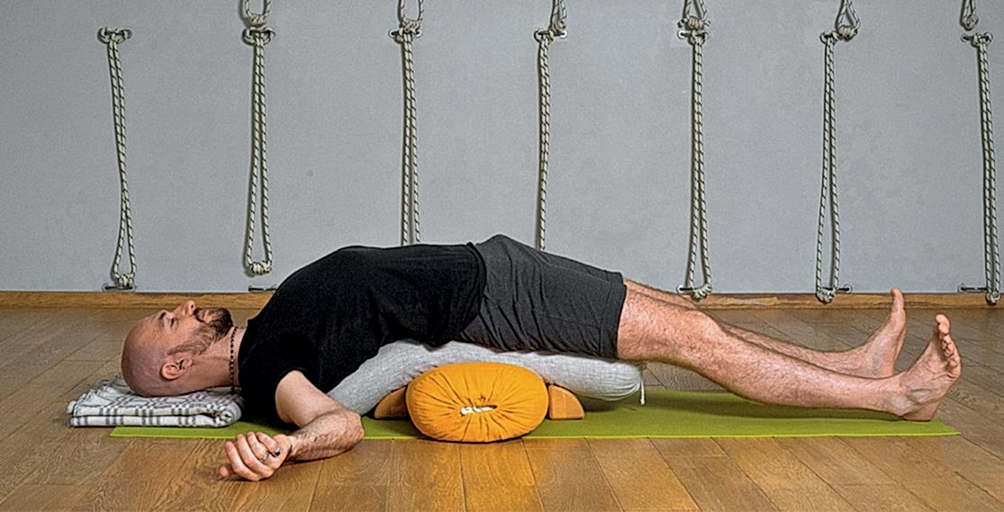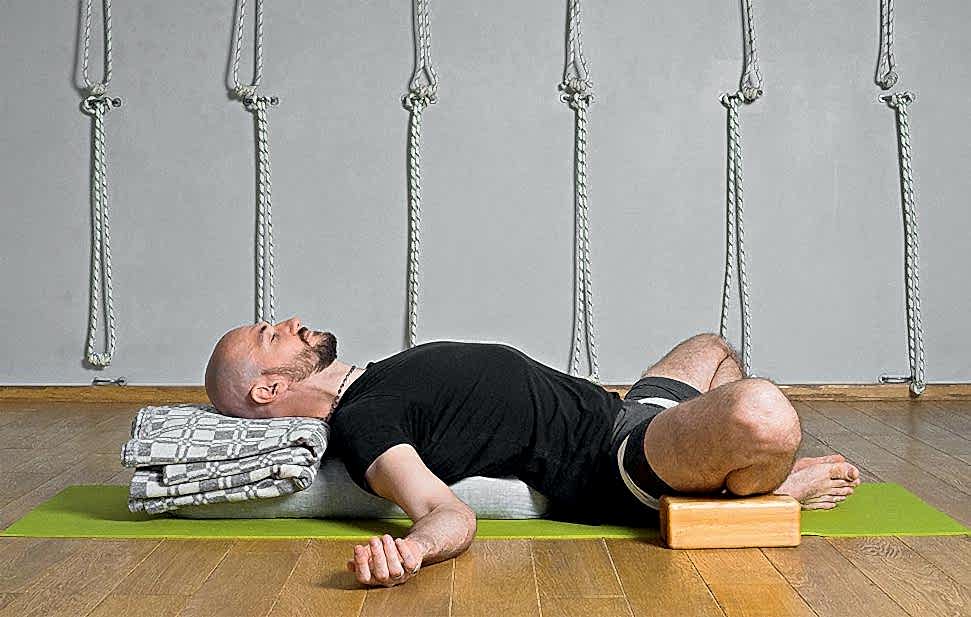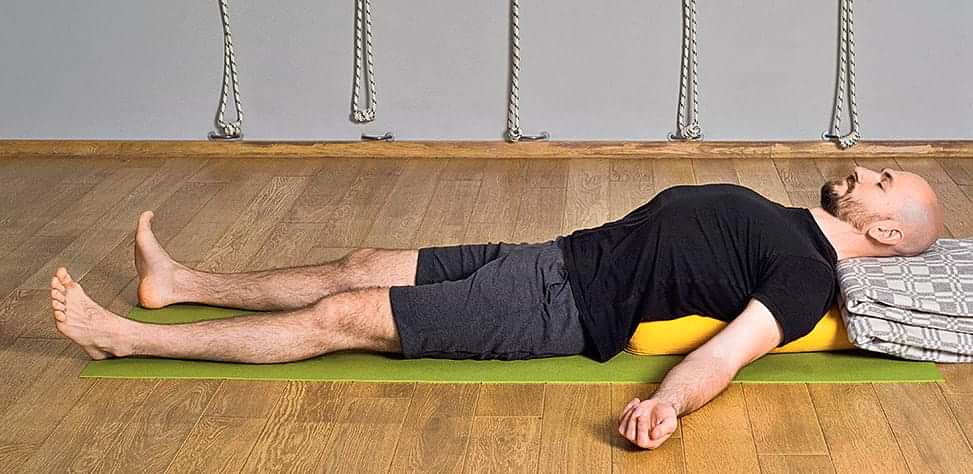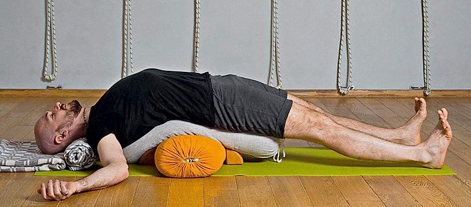Выполните позу на перекрещенных валиках. Голову расположите на одном уровне с копчиком, не отбрасывайте голову назад, положите опору под шею, чтобы горло было расслаблено и шея вытягивалась. Расслабьте руки и ноги в стороны. В этой позе хорошо раскрывается диафрагма, из неё уходит напряжение.