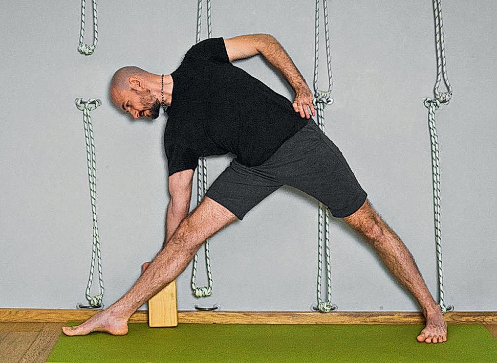 Встаньте спиной к стене, возь-мите кирпич под руку, опускайте трапеции плеч к тазу. Голову опустите вниз, оттягивая заты-лок от шеи, удлиняя заднюю поверхность шеи, смотрите в сторону пола. Можно лоб положить на опору, например, на высокий табурет. Таким образом можно выполнять Уттхита Паршва Конасану, Ардха Чандрасану, положив верхнюю ногу на опору. В позах стоя ноги надо вытягивать, а мозг сохранять пассивным. Тело активное, ум спокойный. Избегайте выполнения Вираб-хадрасаны 1, Вирабхадраса-ны 2, Паривритта Трикона-саны, в них сложно добиться мягкости в теле.