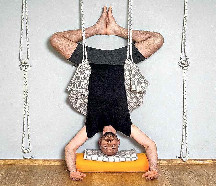 Вы можете выполнять перевёрнутые позы, если у вас стабилизировалось давление и несколько недель держится в норме. Если в данный момент давление высокое, выполнять перевёрнутые позы нельзя. В момент входа в классическую Ширшасану дав-ление повышается , но если Ширшасану выпол-нять правильно, то давление постепенно в позе понижается. Классическую Ширшасану замените на Ширша-сану на верёвках с опорой под головой.Следите в позе за поясницей, не позволяйте ей перегибаться. Располагайте веревку на самой нижней части крестца, чтобы весь позвоночник вытягивался параллельно стене. Положите валик или одеяло под голову, чтобы голова опускалась на опору и переносица была перпендикулярна полу. Когда голова висит, часто возникает чувство тяжести в голове, а напряжённая задняя часть шеи тянет голову назад и шея ещё больше сжима-ется. Не отталкивайтесь руками от пола, рассла-бьте их. Дышите нормально. В таком положении можно находиться до 5 минут.