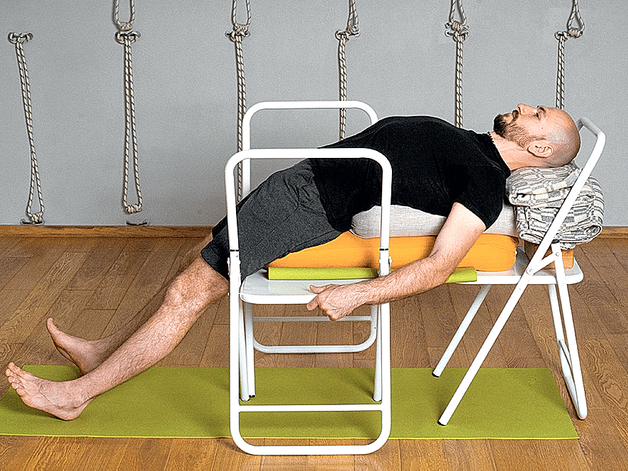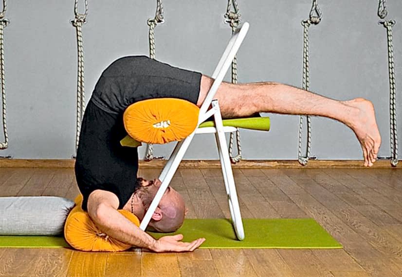 Прогибы назад в классическом выполнении способствуют повышению давления. Поэтому при гипертонии лучше выполнять их на опорах, где не возникает напряжения и разогрева тела. Лучше всего начать прогибы с Саламба Пурвоттанасаны на опоре, поскольку голова здесь расположена выше остального тела. Такое выполнение позы способствует снижению повышенного давления. Расположите таз на стуле, грудную клетку на валиках, а голову на одеяле, чтобы улучшить отток крови от головы. Отпустите ноги и руки широко в стороны, должно быть ощущение, что энергия стекает вниз и напряжение уходит из тела.